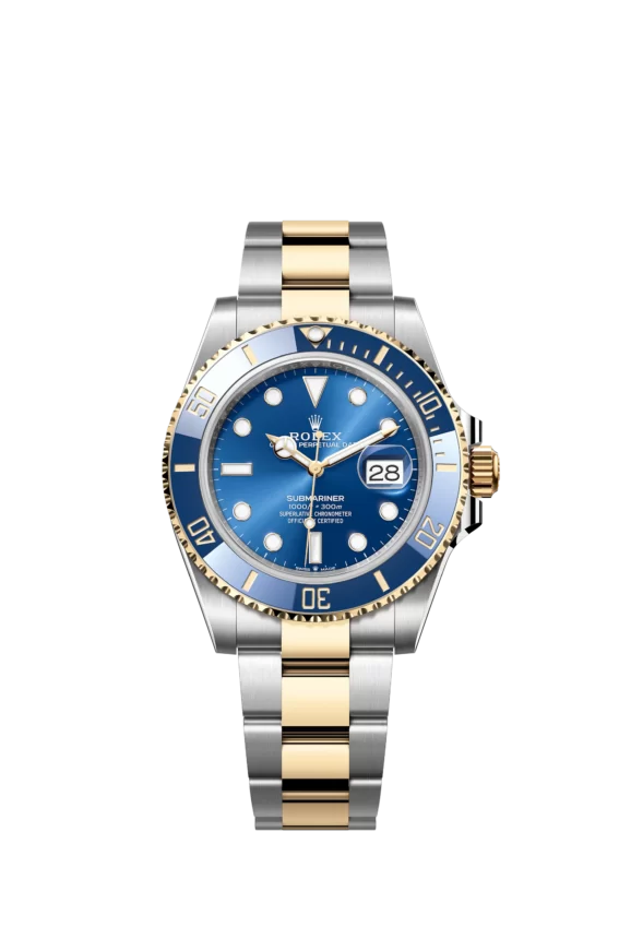 THE OYSTER PERPETUAL SUBMARINER DATE IN OYSTERSTEEL AND YELLOW GOLD WITH A CERACHROM BEZEL INSERT IN BLACK CERAMIC AND A BLUE DIAL WITH LARGE LUMINESCENT HOUR MARKERS.